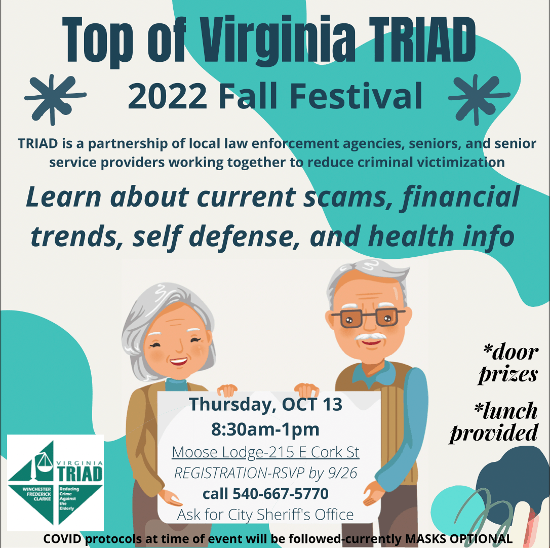 Top of Virginia TRIAD 2022 Fall Festival Posted byvirginiasmpOctober 11, 2022September 7, 2022Posted inUncategorized Thursday, October 13, 8:30am-1pm. Learn about current scams, financial trends, self defense and health info! Related