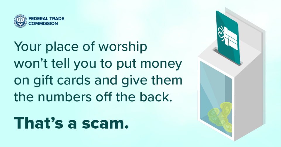 You get an email from someone in your place of worship asking you to buy gift cards for a worthy cause. It might look legit, but hold on. Some scammers pretend to be pastors, rabbis, imams, or bishops to steal worshippers’ money. Learn to spot gift card scams — or your money might end up in a scammer’s collection plate. (Read More)